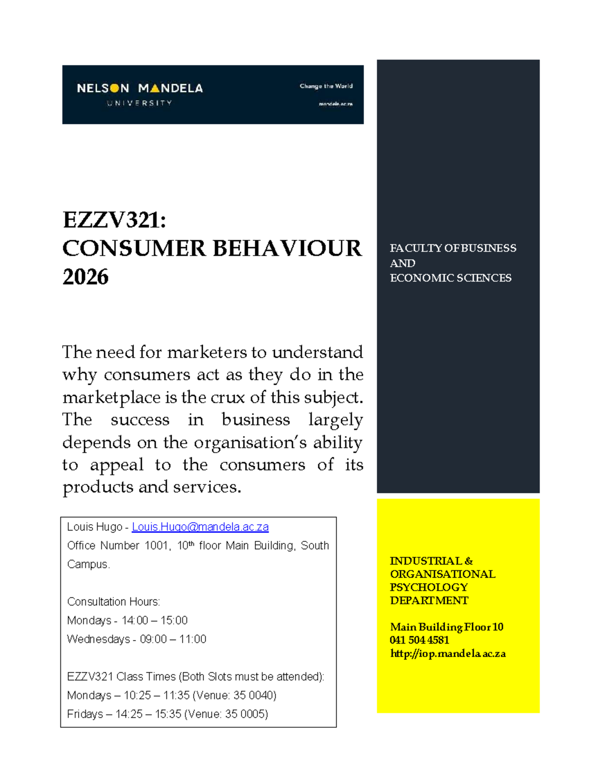 EZZV321: Consumer Behaviour Module Outline 2026 - South Campus - Studocu