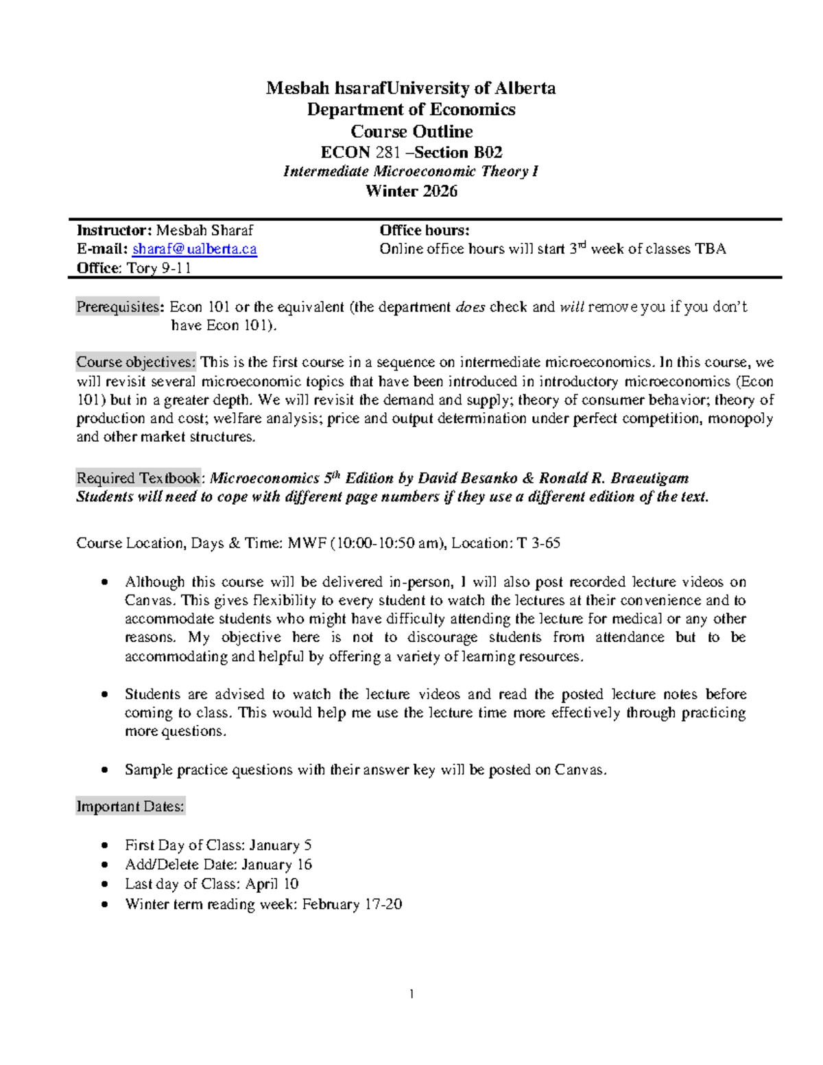 ECON 281 B02 Course Outline: Intermediate Microeconomic Theory I Winter ...