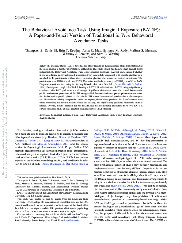 (PDF) The Behavioral Avoidance Task Using Imaginal Exposure (BATIE): A ...