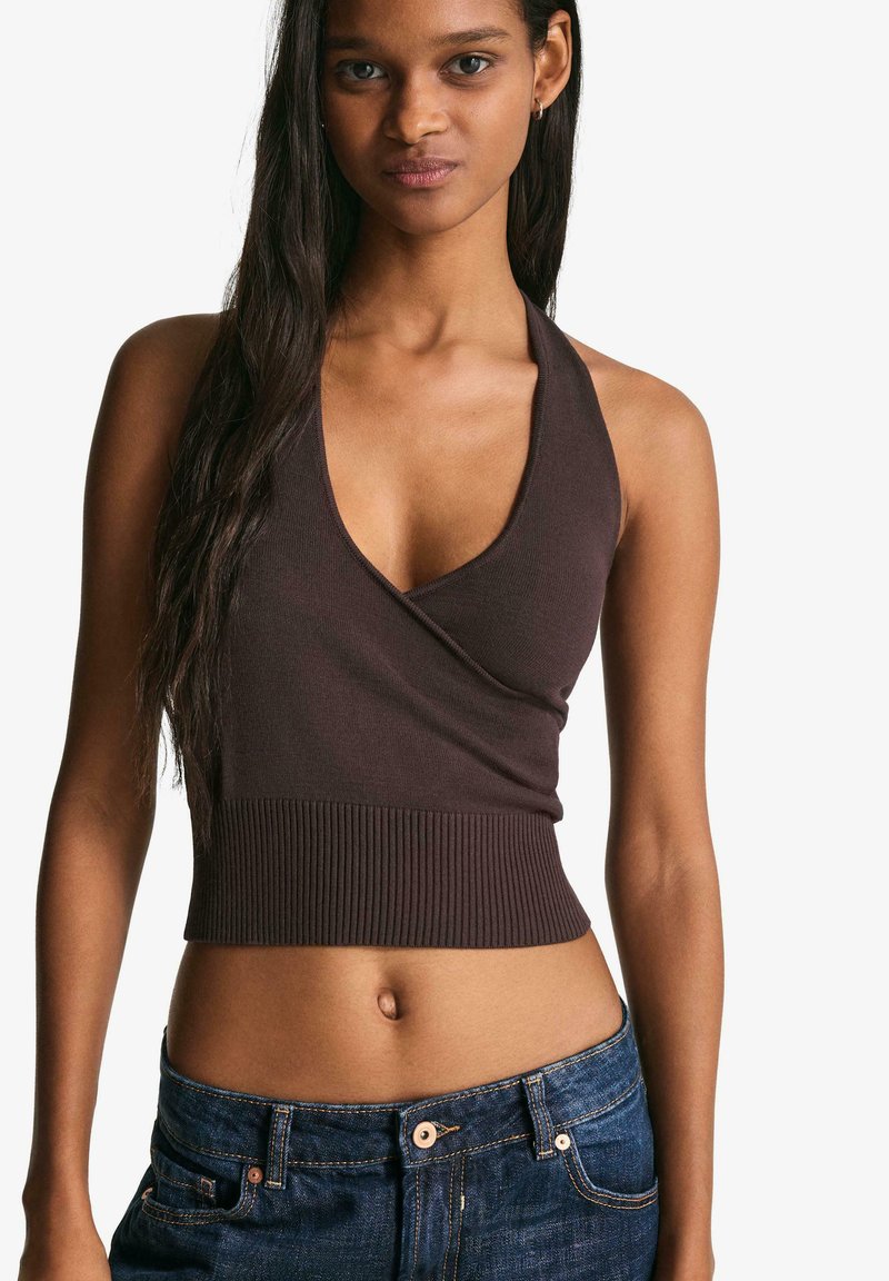 Bershka SURPLICE HALTER - TOP 08753376 - Top - dark brown - Zalando.ie