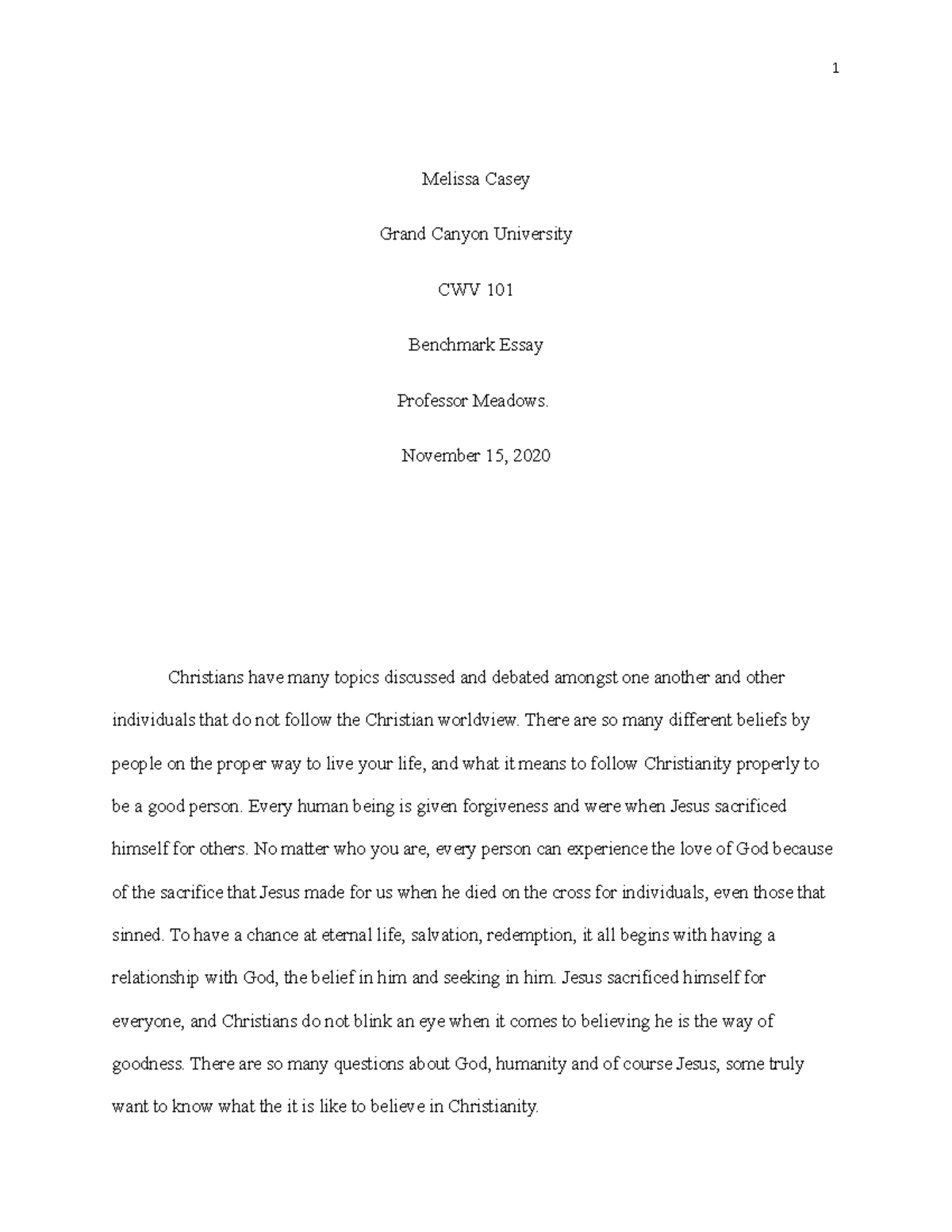 Benchmark - Grade: b - Melissa Casey Grand Canyon University CWV 101 ...