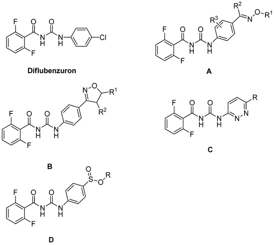Chemical structure of benzoylphenyl urea insect growth regulators. (A ...