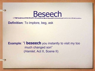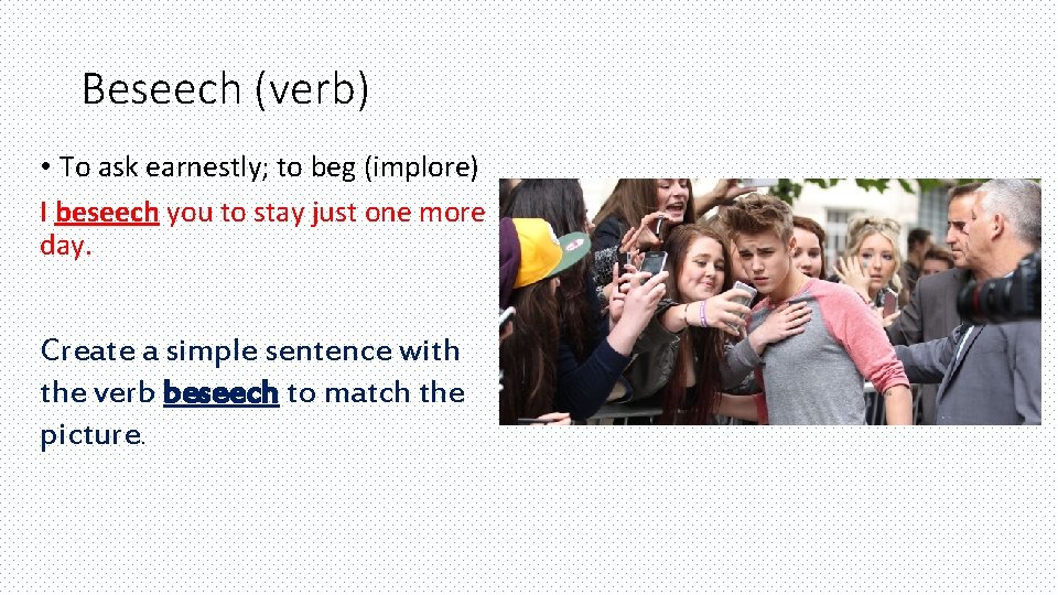 PPT - beseech (verb) to ask earnestly; to beg clue: beseech=beg ...