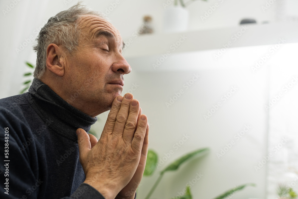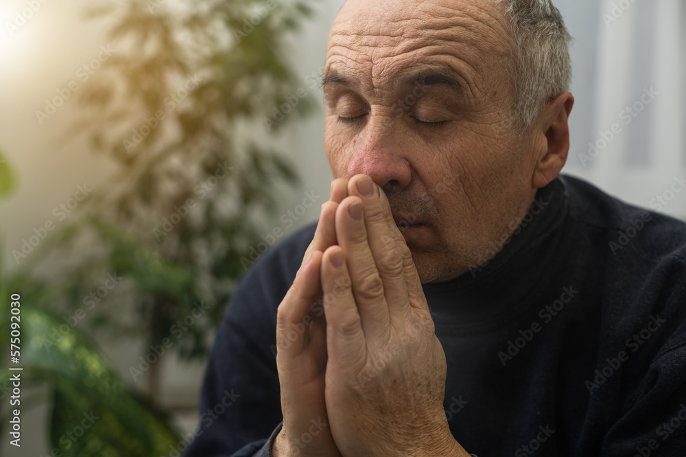 Worried Religious Senior Man Praying To God With His Hands Raised And ...