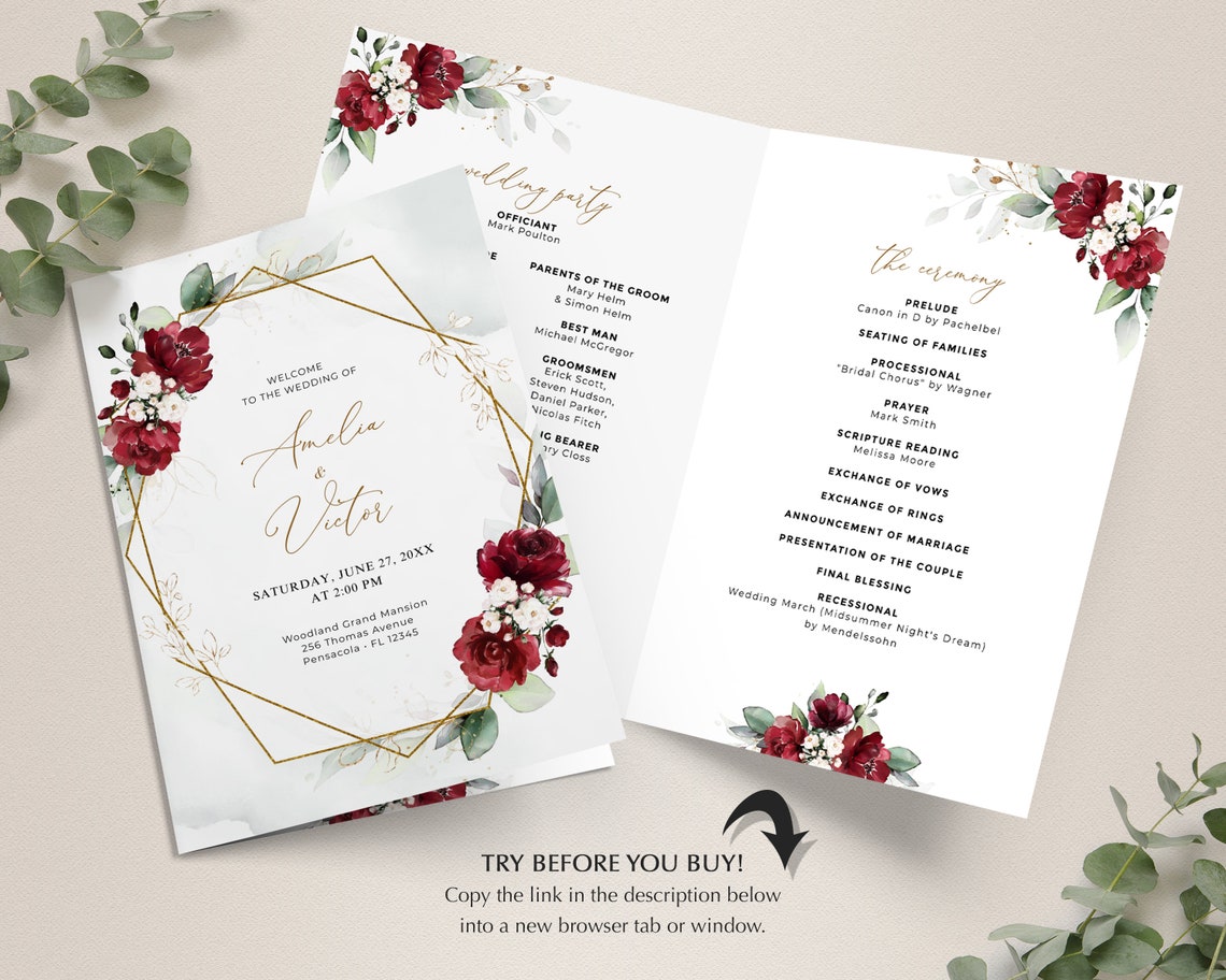 Bi-fold Wedding Program Template With Burgundy Roses, Wedding Order of ...