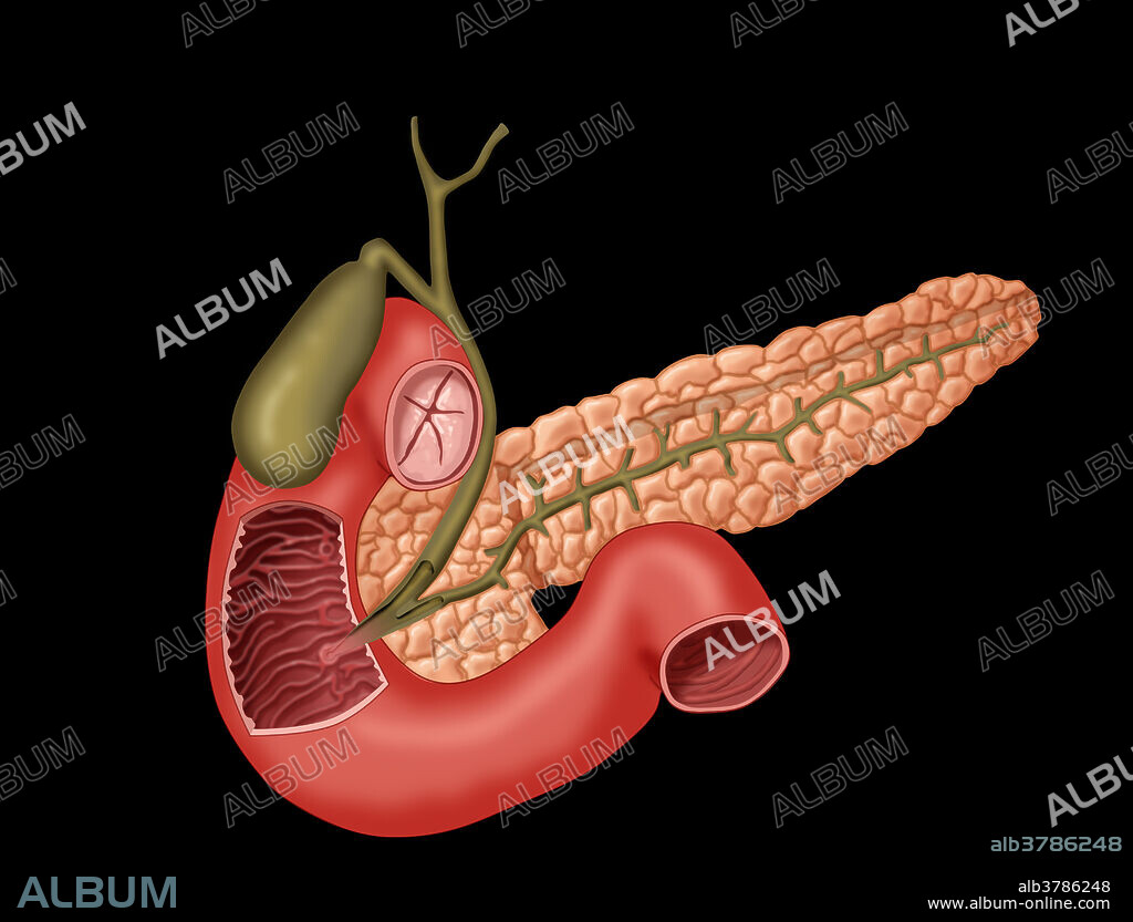 Biliary system with the liver, gallbladder, pancreas, duodenum, bile ...