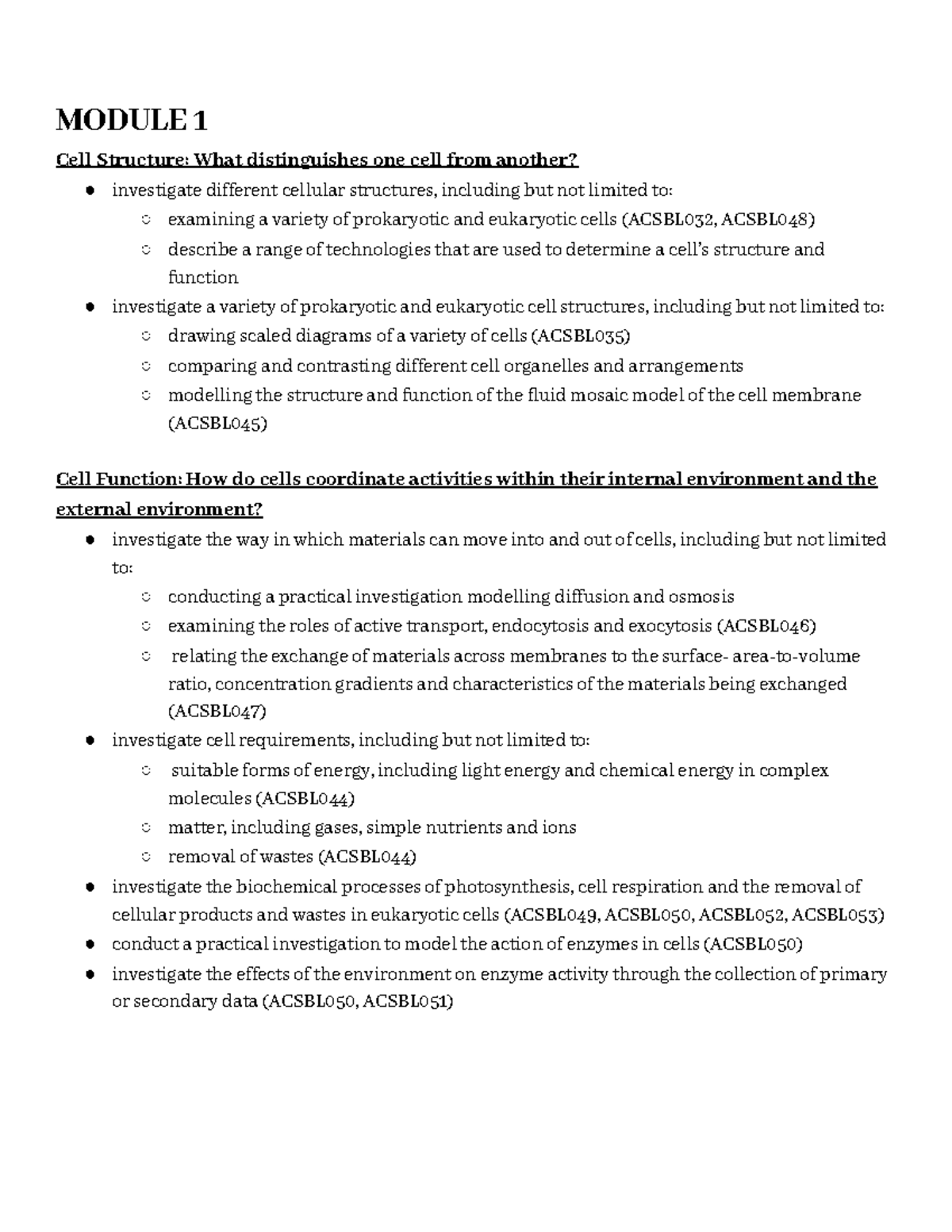 Biology Module 1: Cell Structure & Function Overview (ACSBL032 ...