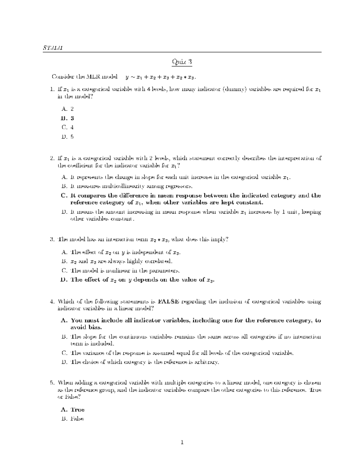 ST3131 Quiz 3 Solutions: MLR Model & Categorical Variables - Studocu