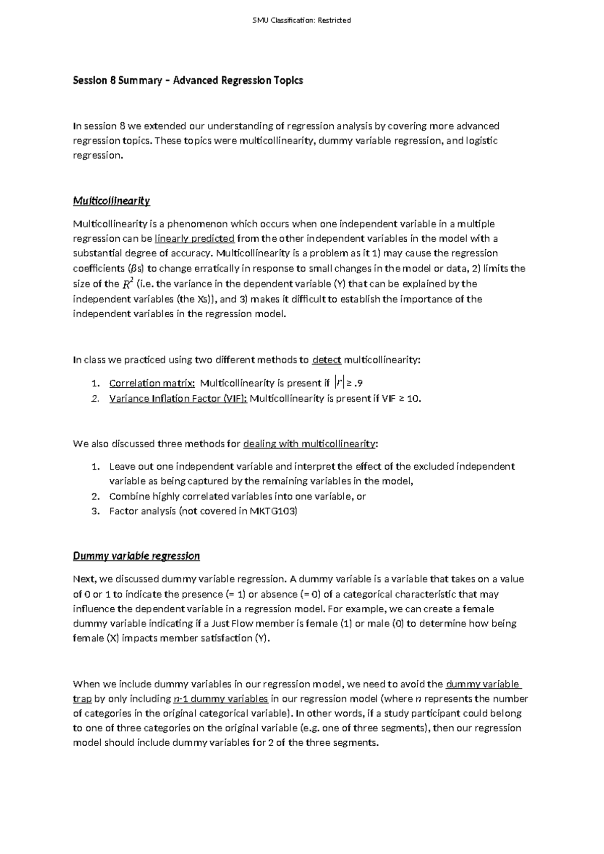 SMU MKTG103: Session 8 Summary on Advanced Regression Topics - Studocu