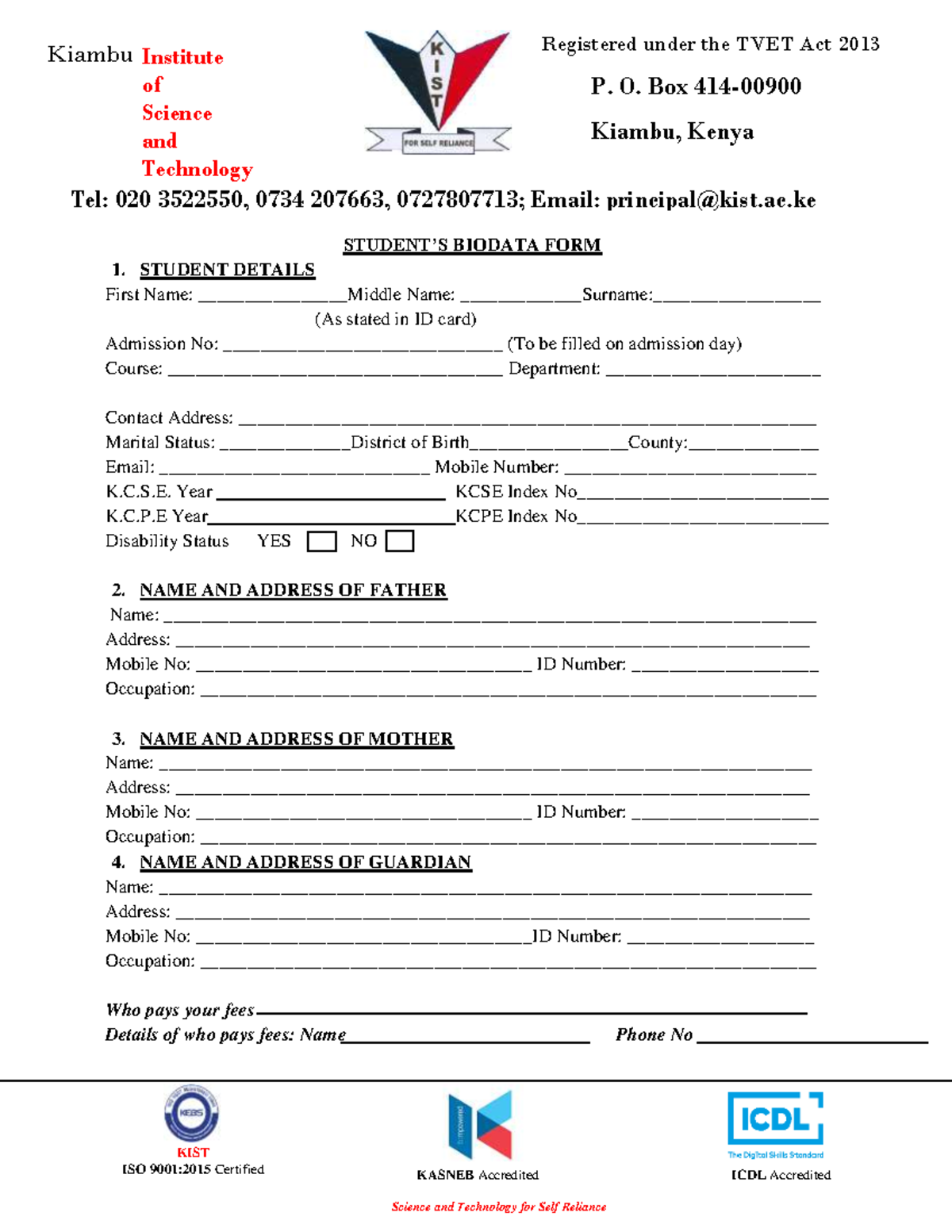 Admission Biodata FORM - Science and Technology for Self Reliance ...