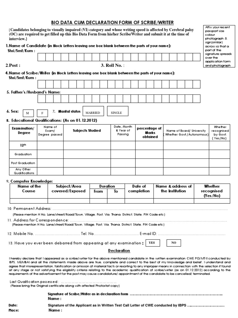 Bio Data Cum Declaration Form of Scribe/Writer | PDF | Academic Degree ...