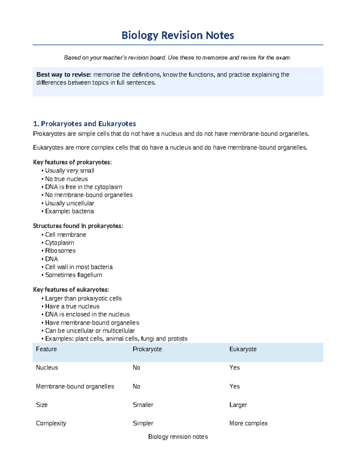 Biology Revision Notes for Exam: Prokaryotes, Eukaryotes & More - Studocu