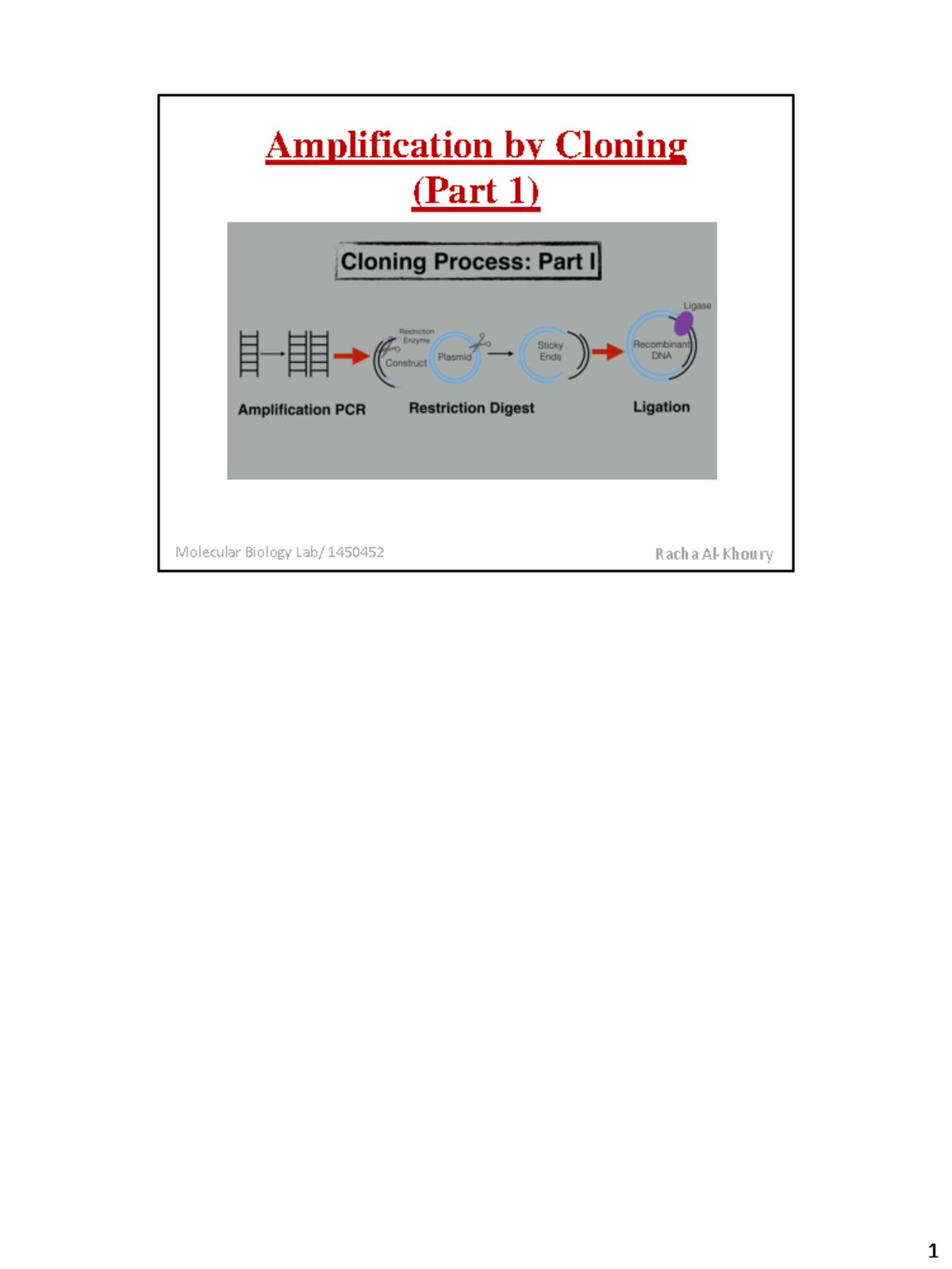 Molecular Biology 1450452: Amplification by Cloning Lab Notes - Studocu