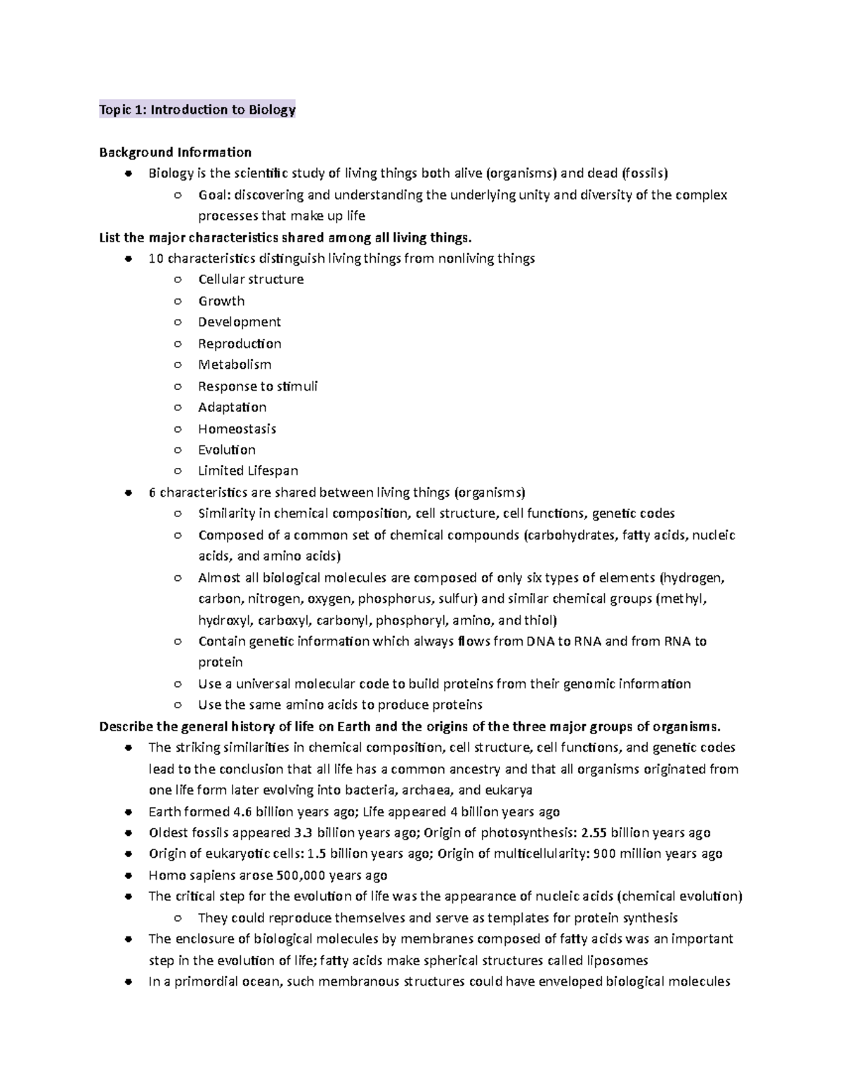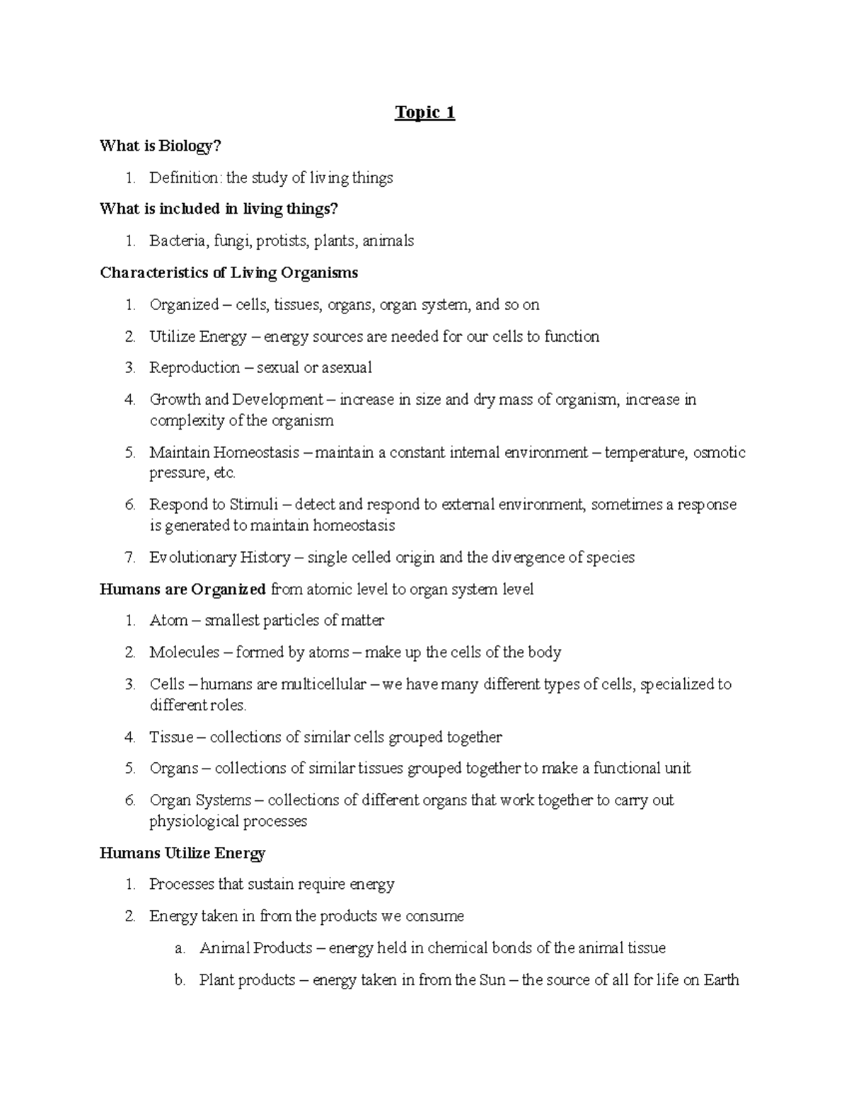 Bio 1 - lecture notes - Topic: Introduction to Biology Definition of ...