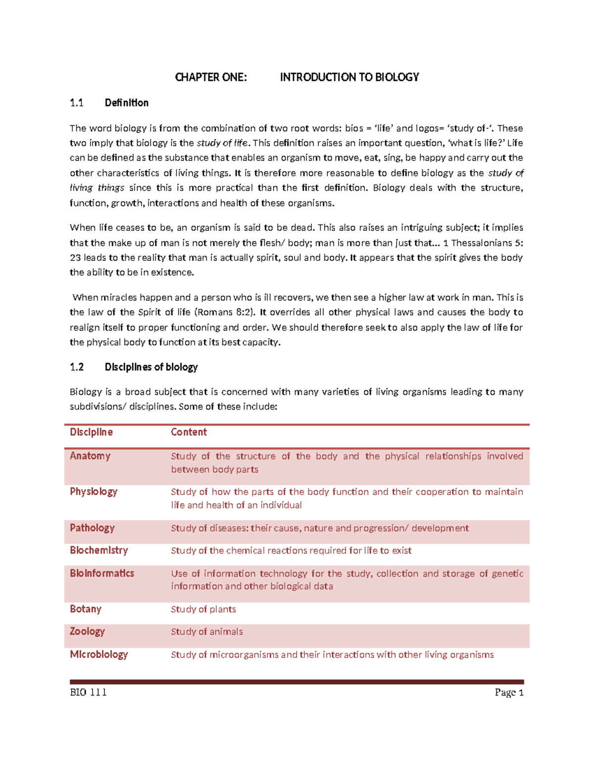 Bio Notes 1 - Introduction to Biology Definition of biology as the ...