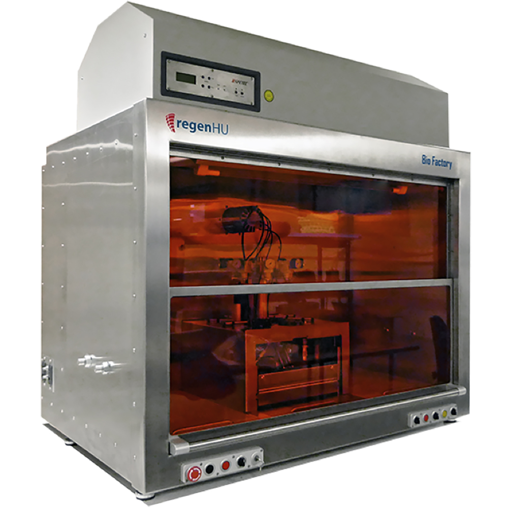 A detailed illustration of a modern bioprinter displaying advanced ...