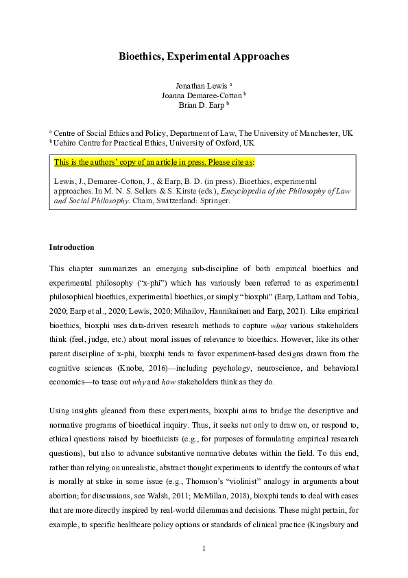 (PDF) Bioethics, experimental approaches