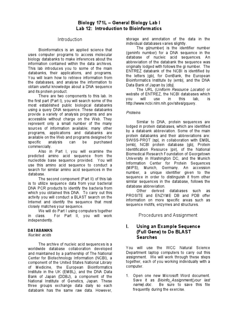 Lab 1- Bioinformatics Introduction and Protocol - BIOL1020 - LAB 1 ...