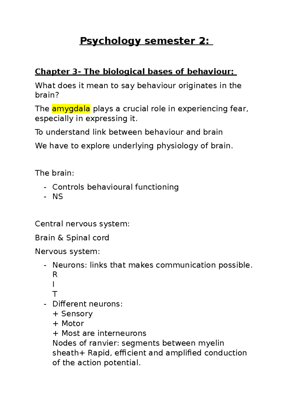 Psychology Semester 2: Chapter Notes on Biological Bases of Behavior ...