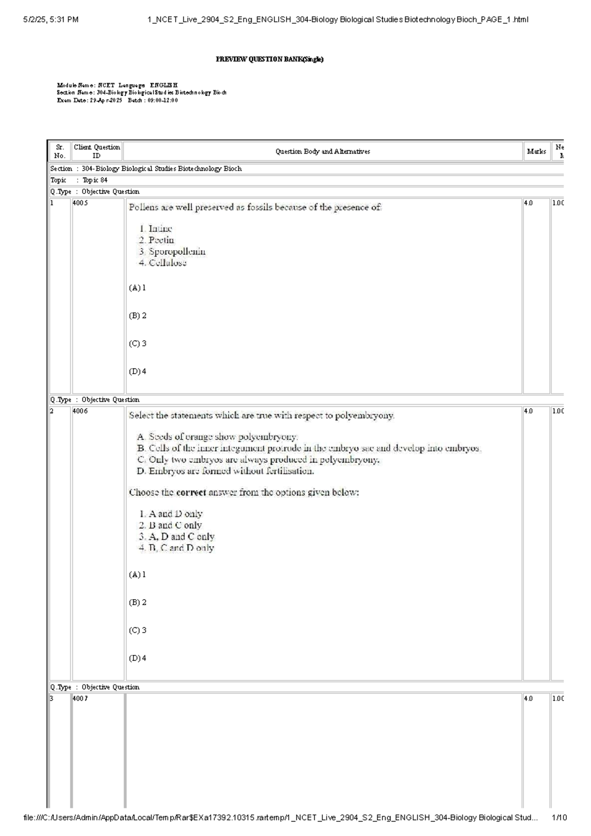 NCET Biological Studies Biotechnology Bioch Quiz Question Bank - Studocu