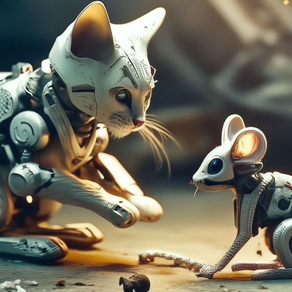 "Bionic cat playing with a bionic mouse" — image created in Shedevrum
