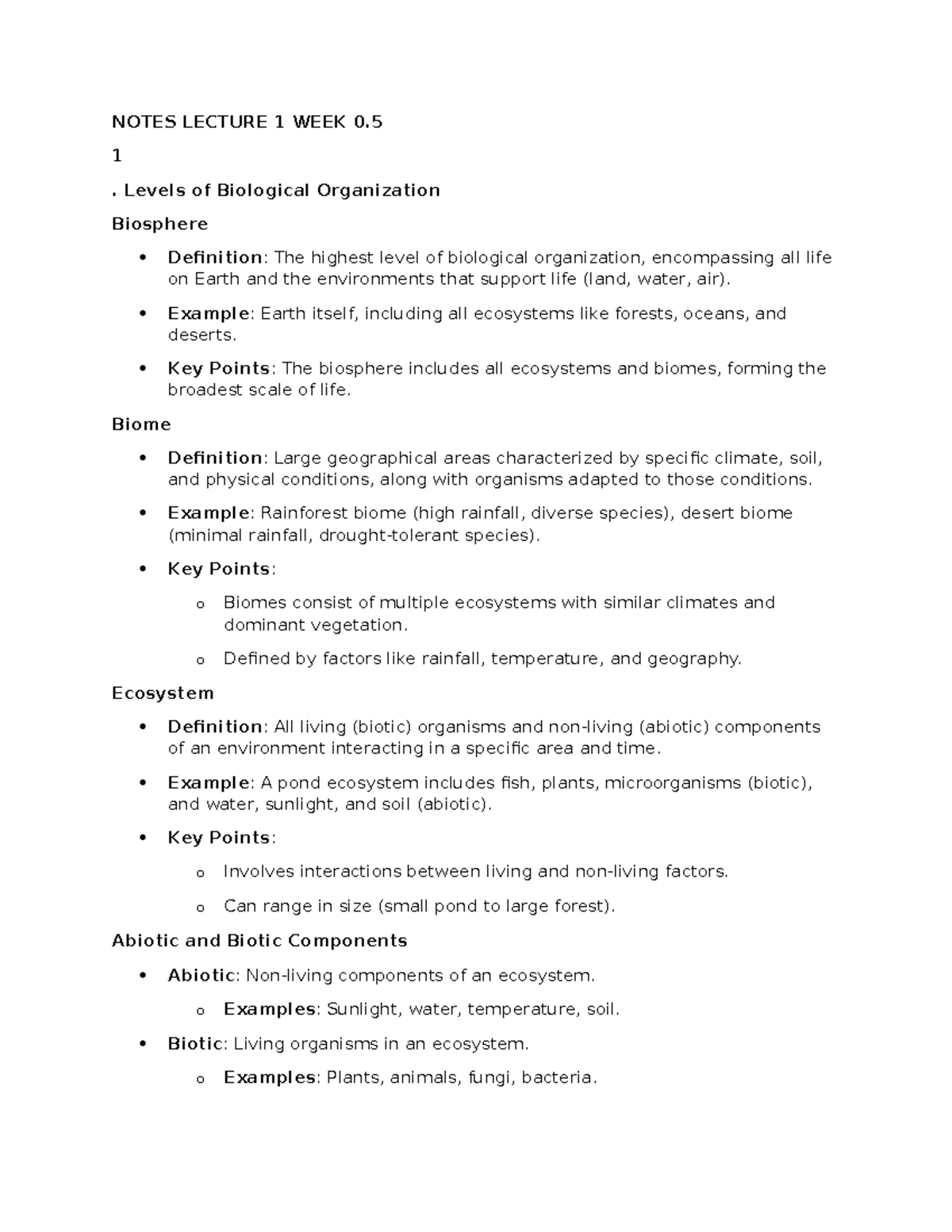 Lecture 1 Notes - NOTES LECTURE 1 WEEK 0. 1 . Levels of Biological ...