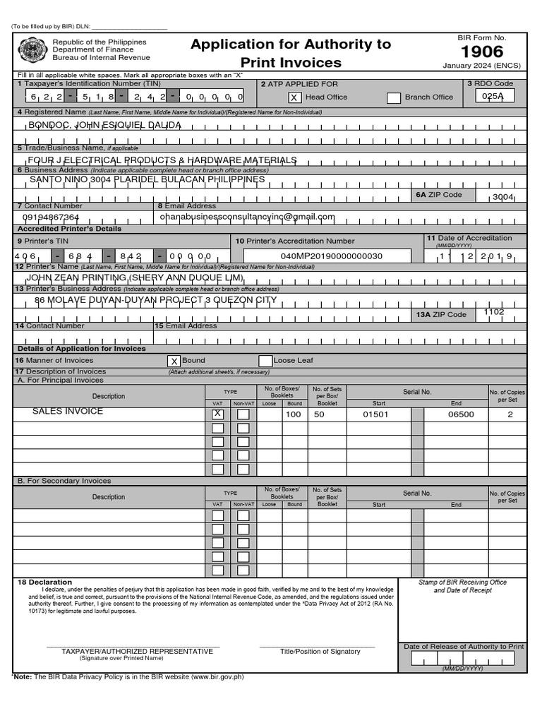 BIR Application for Invoice Printing | PDF | Invoice | Identity Document