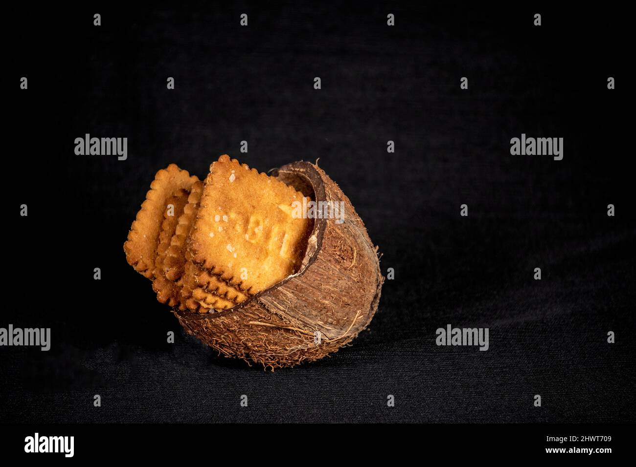 Biscuit In Coconut Shell Isolated In Black Background Stock Photo - Alamy