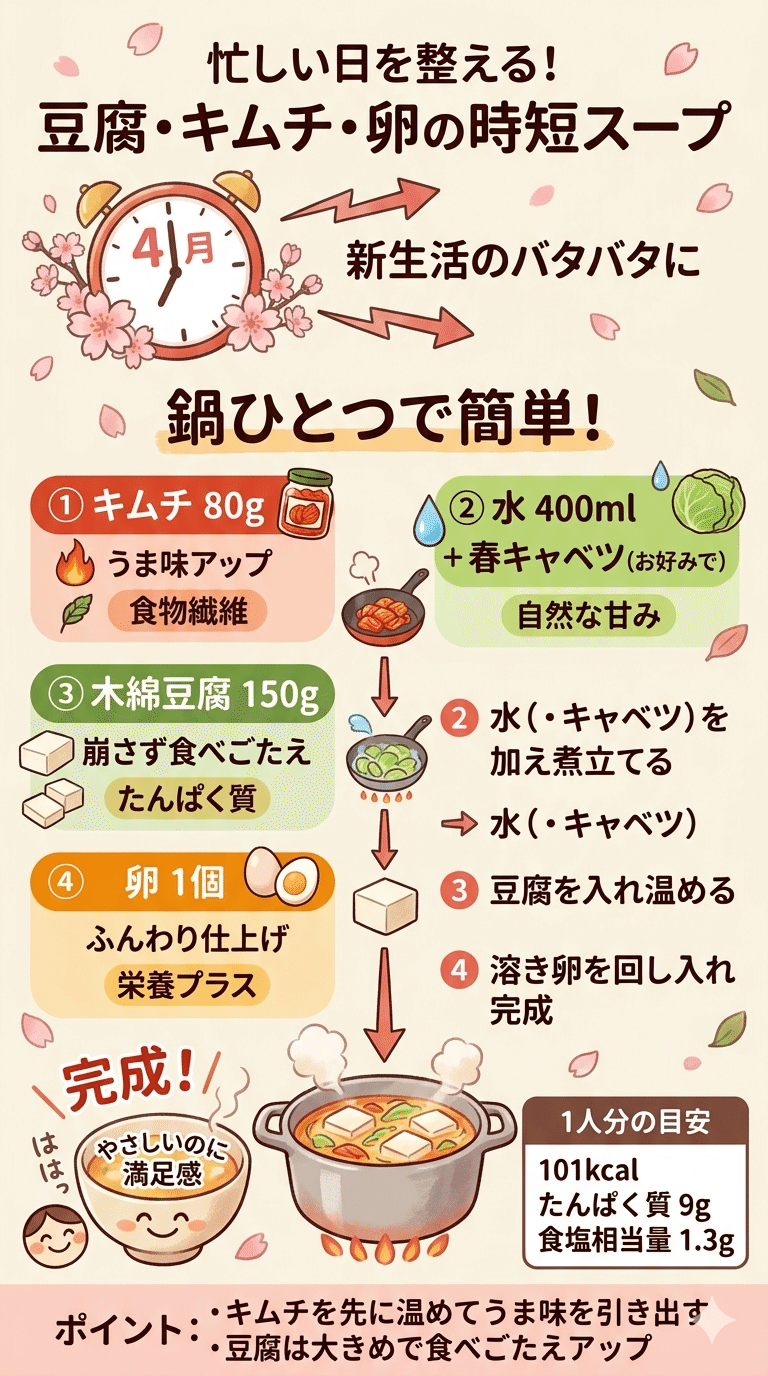 4月の忙しい日にうれしい。鍋ひとつで整う、豆腐とキムチの時短・節約献立|管理栄養士ゆきなべ