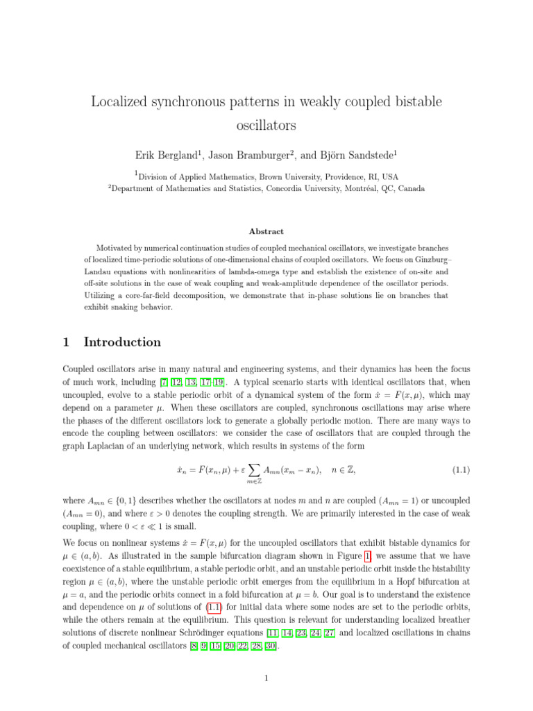 Localized Synchronous Patterns in Weakly Coupled Bistable Oscillators | PDF