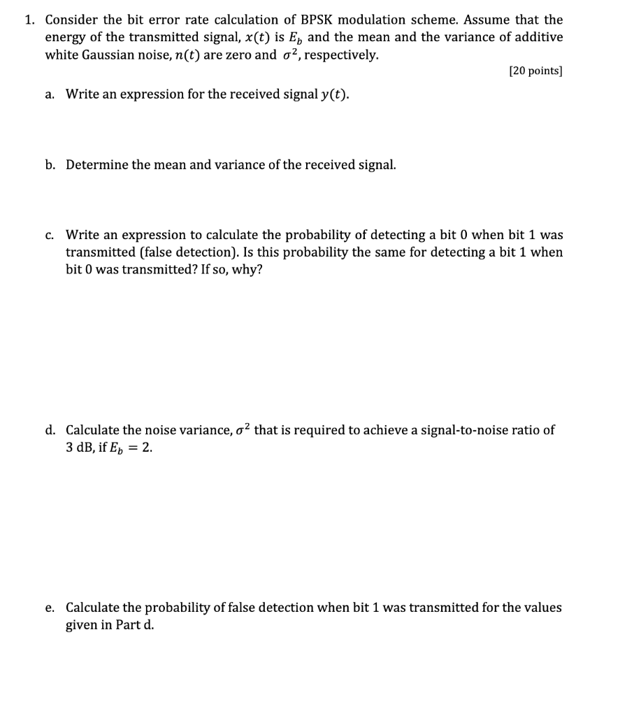 1. Consider the bit error rate calculation of BPSK | Chegg.com