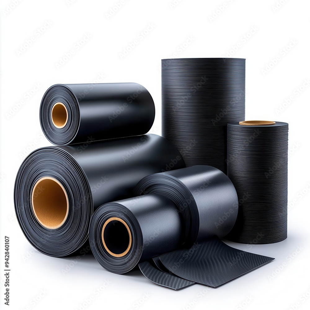 Rolls of new black roofing felt or bitumen. Group of rolls of ...