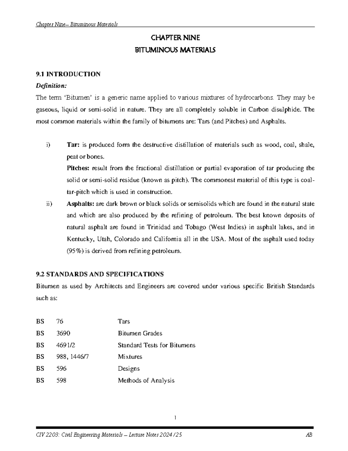 CIV 2203: Lecture Notes on Bituminous Materials - Chapter 9 Overview ...