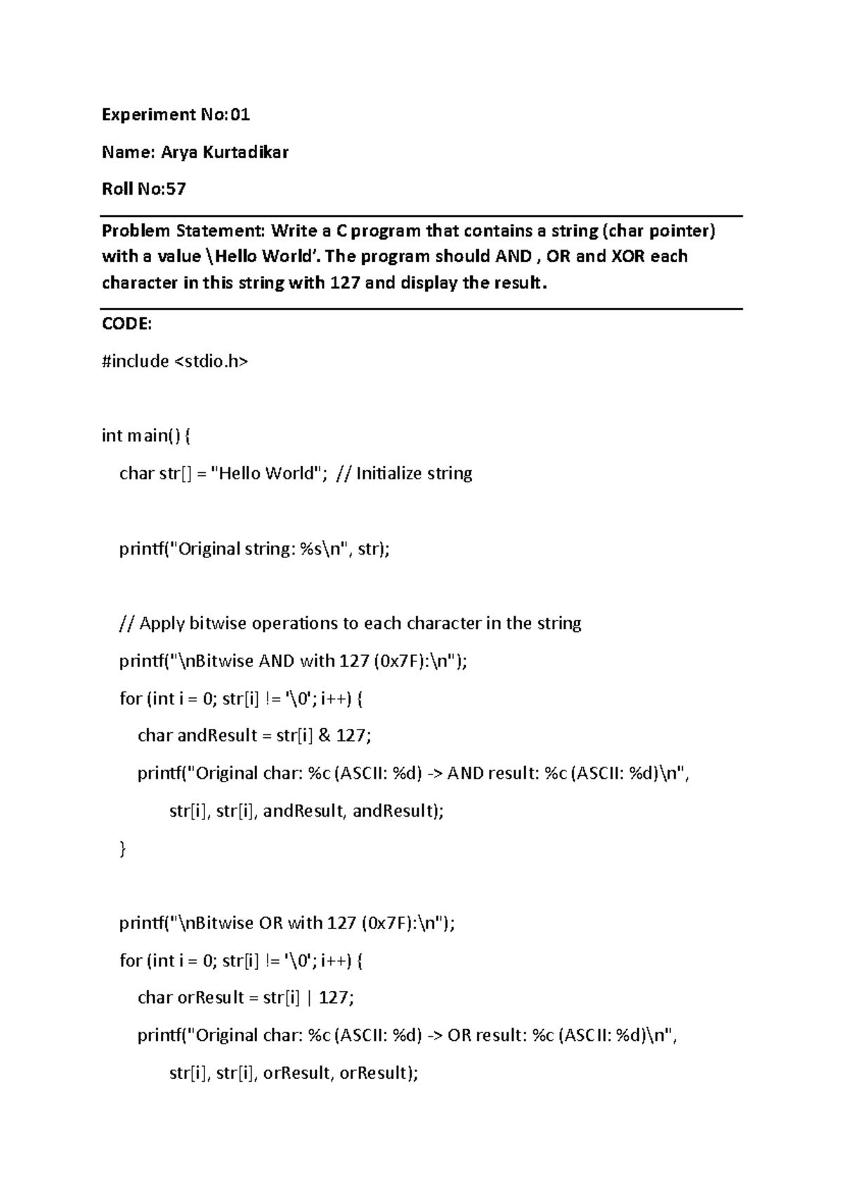 Prac 01 IS: C Program for Bitwise Operations on Strings - Studocu