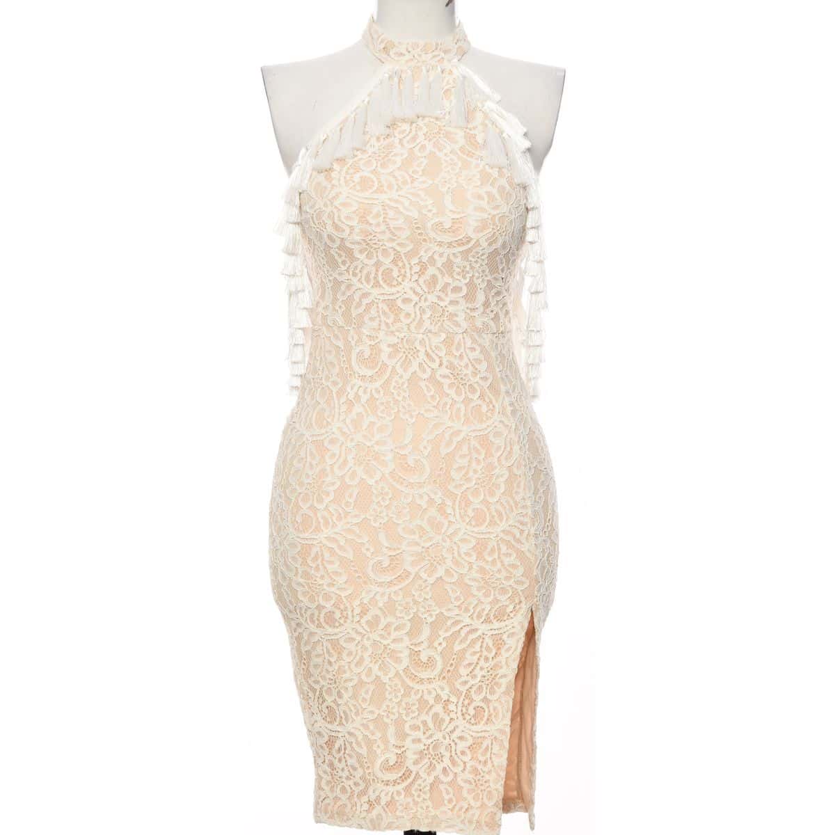 Blithe Women's Size M Halter Neck Midi Dress Beige with White lace (s)
