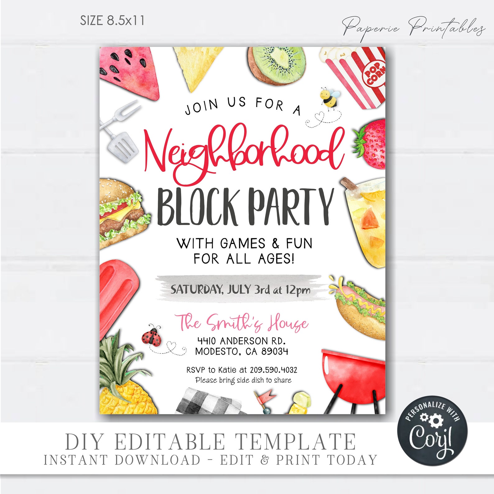 EDITABLE Neighborhood Block Party Invite, Printable Invitation ...