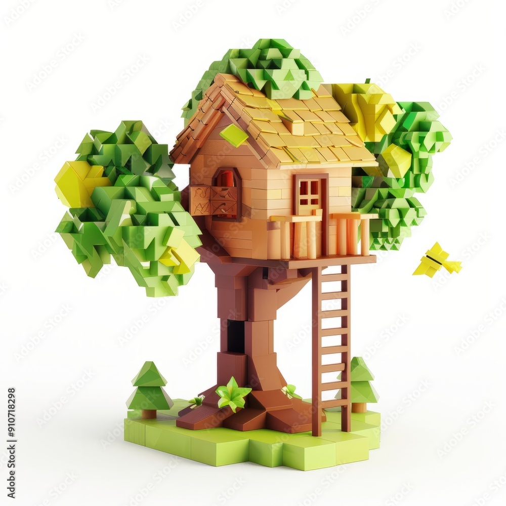 3D Render, Low Poly style of Toy Block Treehouse, on isolated white ...