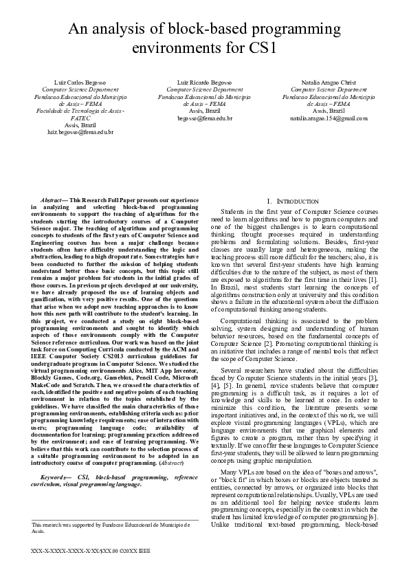 (PDF) An analysis of block-based programming environments for CS1