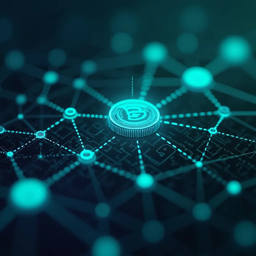 3D Blockchain Networks and Floating Digital Coins in a Glowing Abstract ...