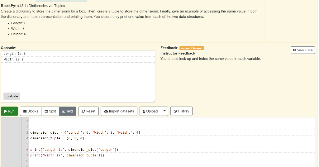 BlockPy: #43.1) Dictionaries vs. Tuples Create a | Chegg.com