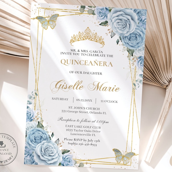Baby Blue Quinceanera Invitation EDITABLE XV Añera Digital Dusty Light ...