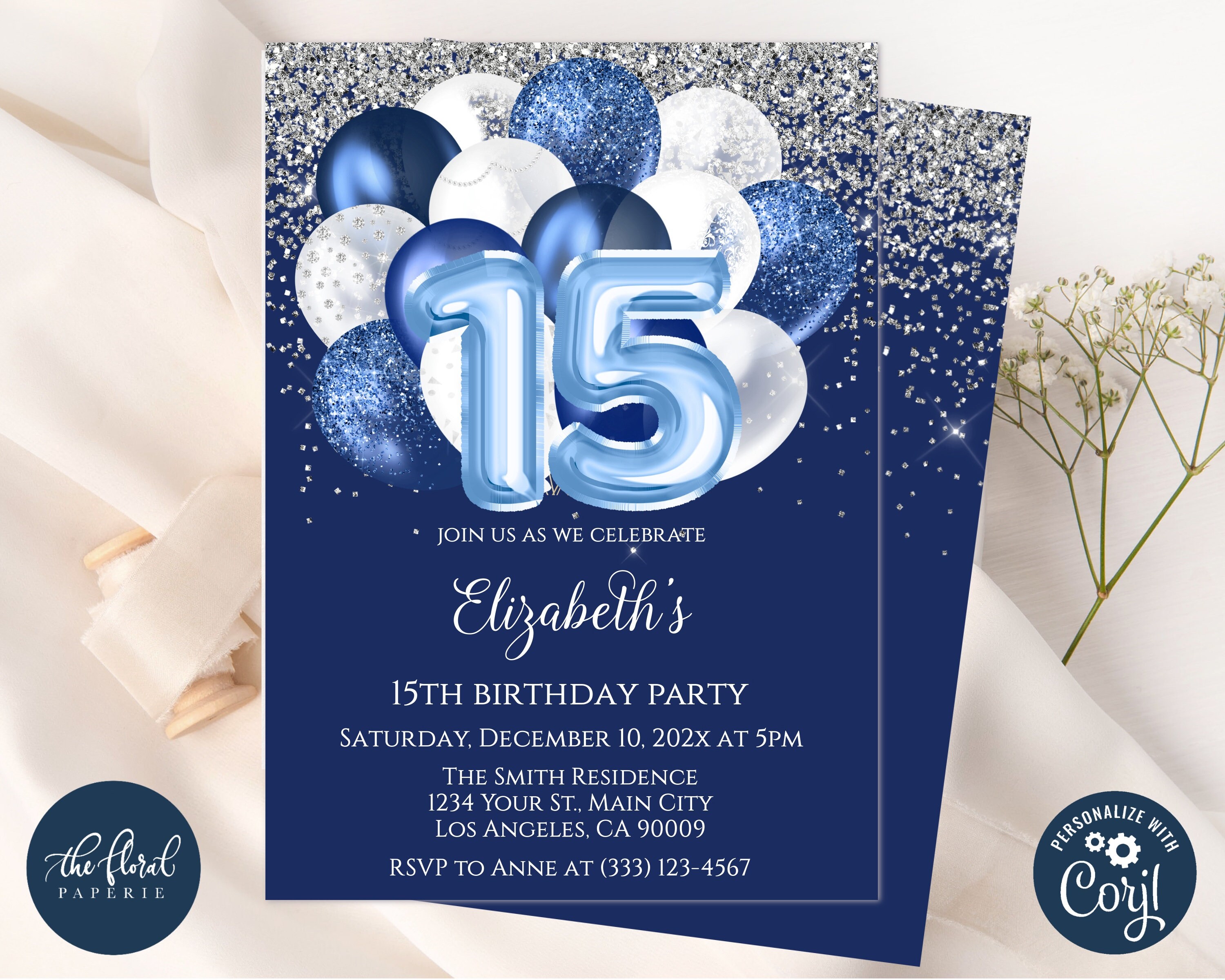Editable Blue 15th Birthday Invitation Template, Glitter Birthday Party ...