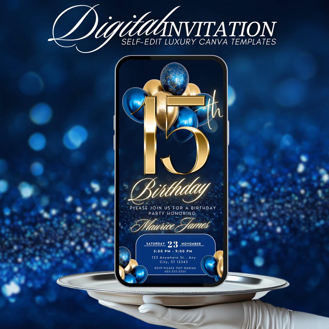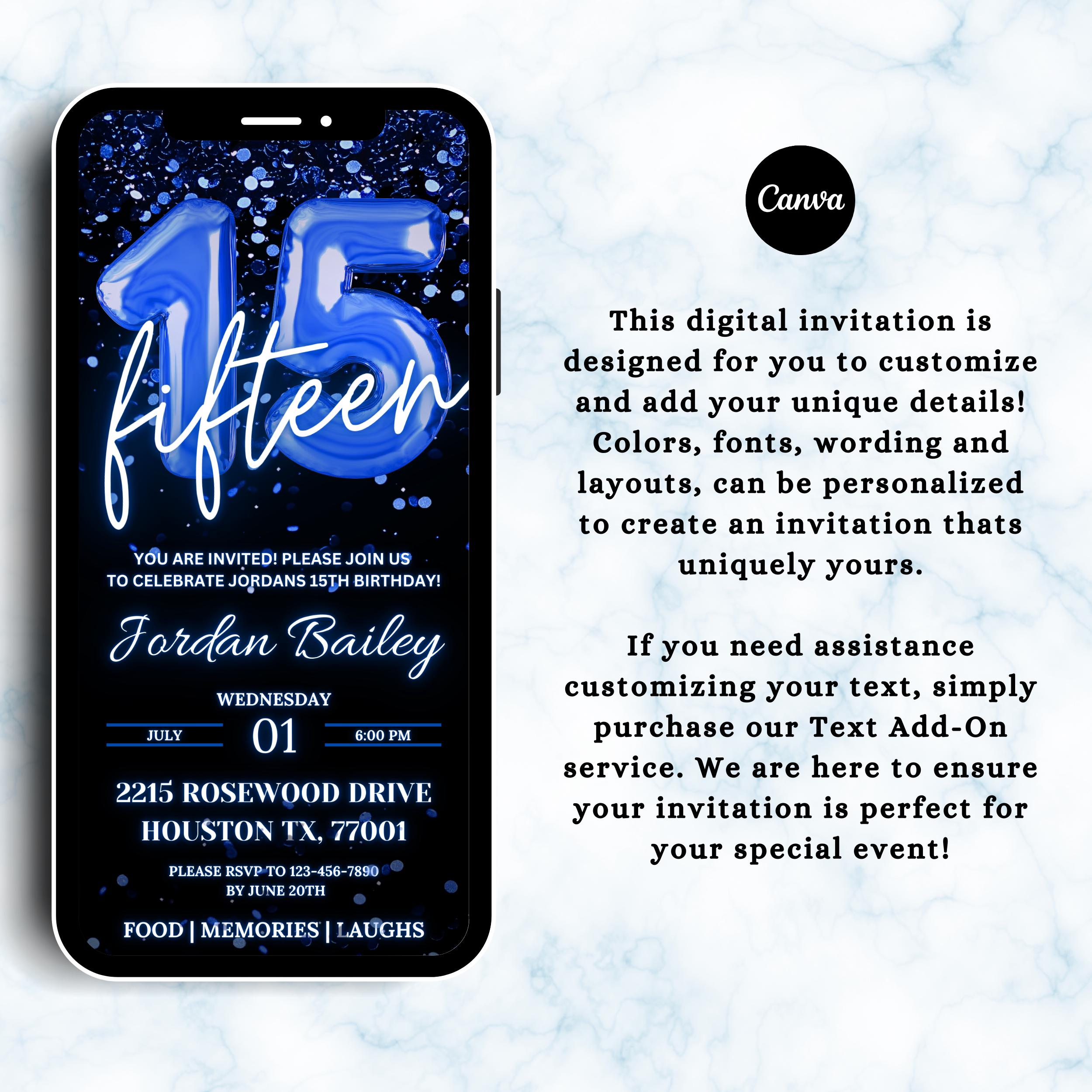 15th Blue Digital Invitation, Birthday Evite, Edit in Canva, 15th Bday ...