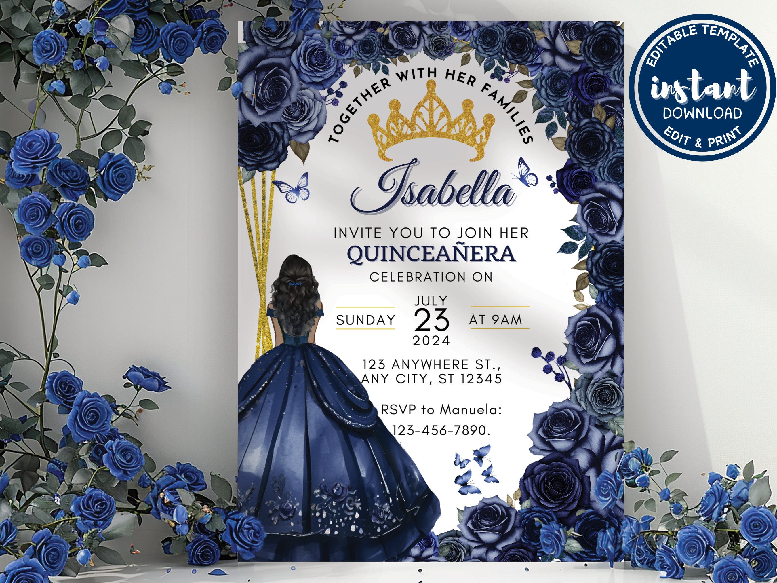 Royal Blue Roses Quinceañera Invitation Editable Template Butterfly ...