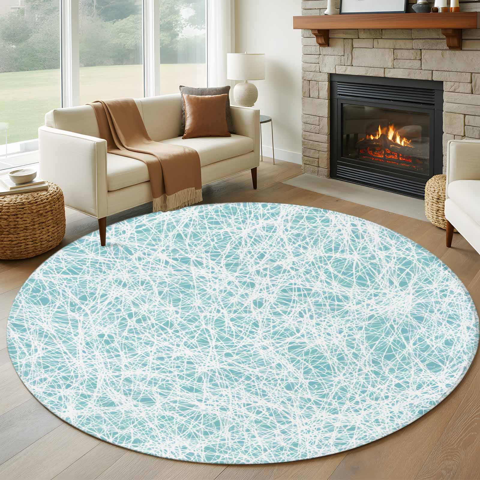 Abstract Fiber Line Round Rug 5Ft Spring Vibrant Blue White Art Cobweb ...
