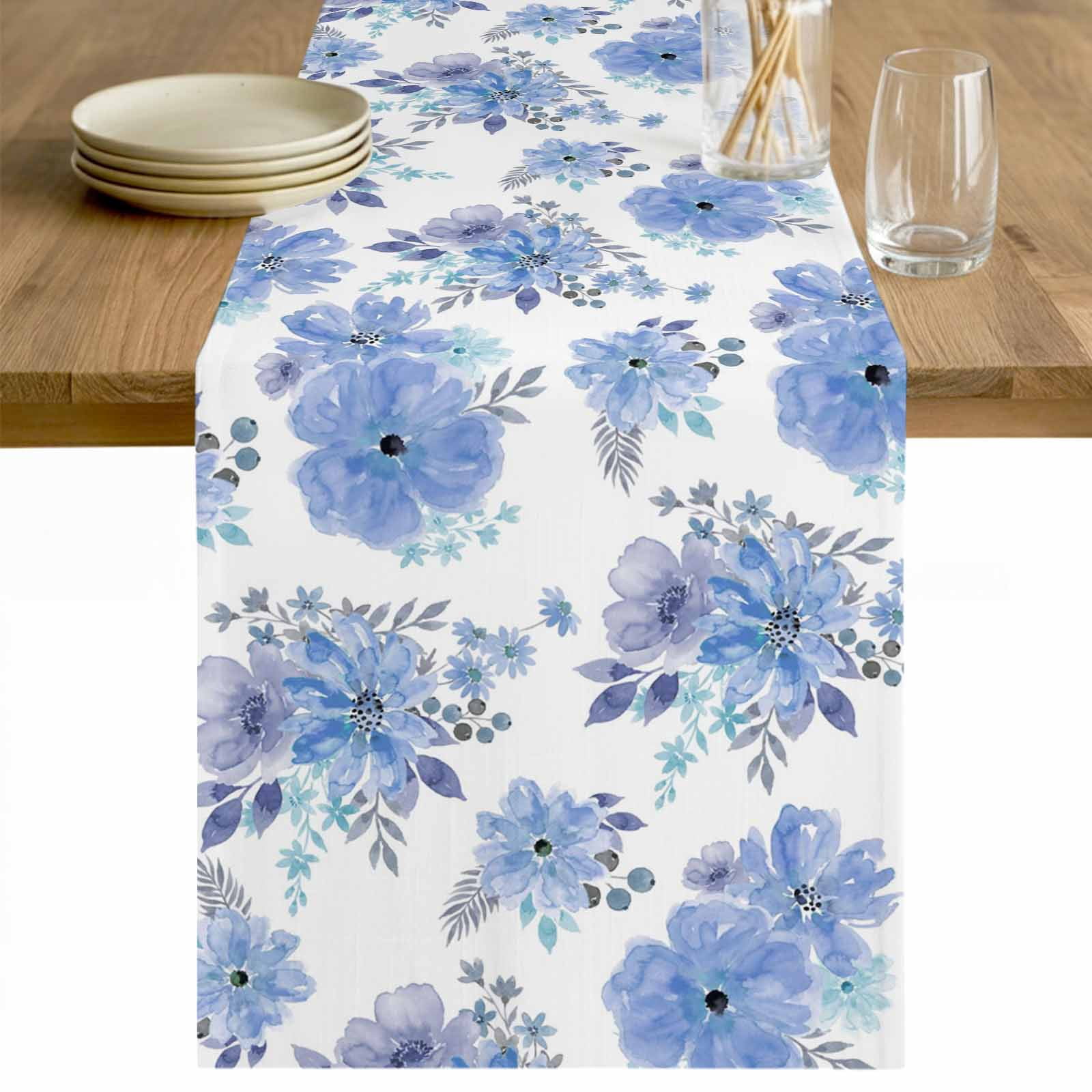 Blue Watercolor Floral Table Runner - 70 Inch Long Spring Flower ...