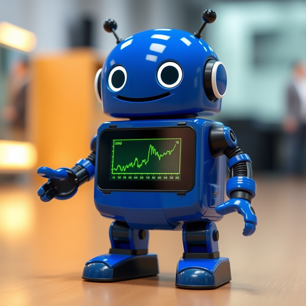 Friendly Blue Robot with a Screen Displaying Data Trends and Analytics