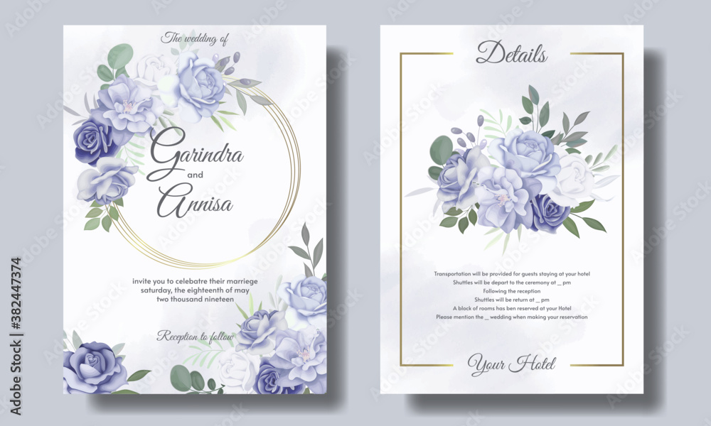 Beautiful blue floral frame wedding invitation card template set ...