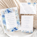 Wedding invitation design with bunch of blue flowers on light blue ...