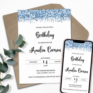 Light Blue Birthday Party Invitation, Sparkling Glitter Invite for a ...